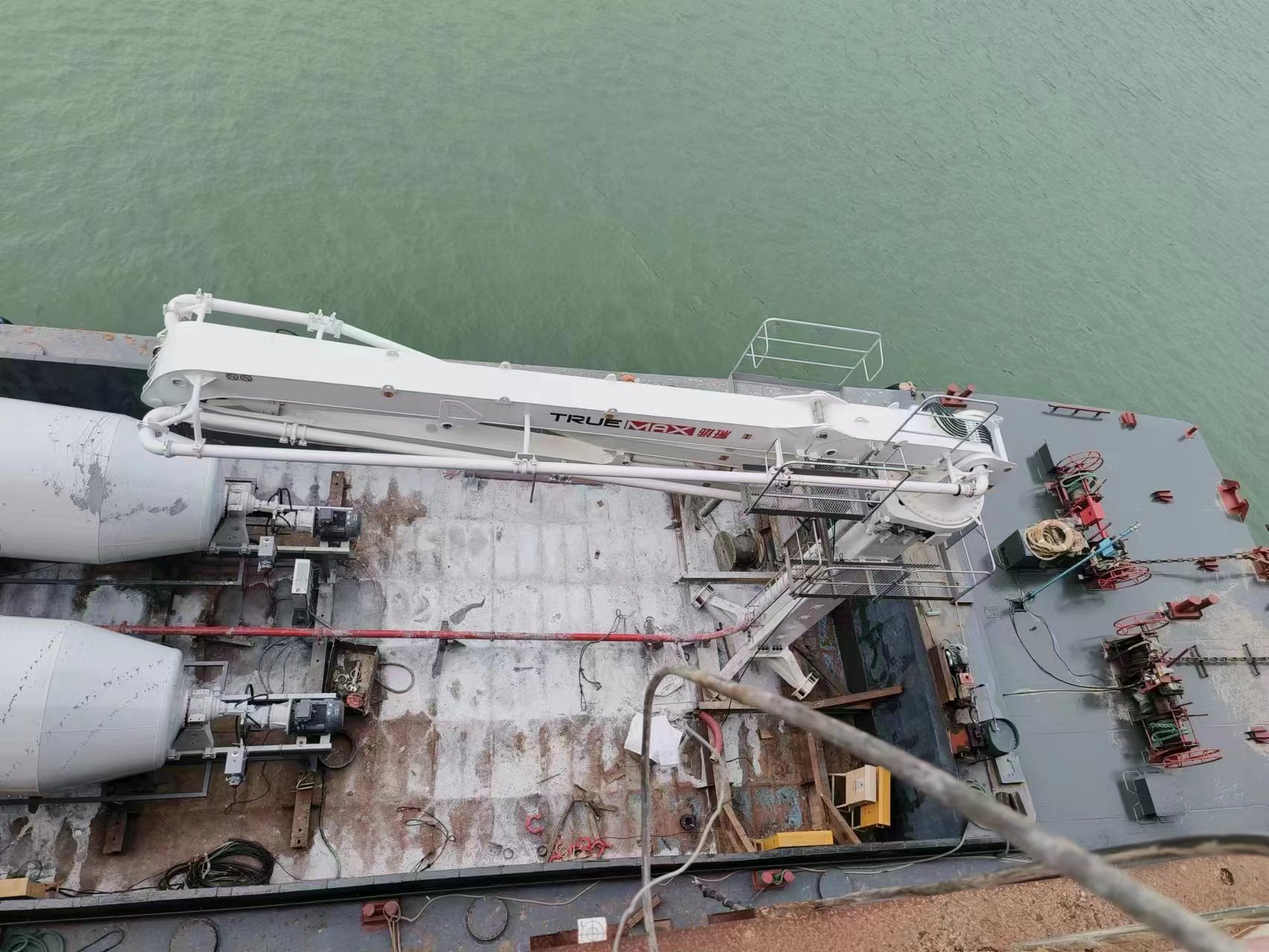 船載式混凝土布料機是一款碼頭、跨海大橋、橋墩等復(fù)雜項目施工混凝土泵送設(shè)備,把布料機安裝在船上或者甲板上進行固定安裝,把攪拌罐放置在船艙內(nèi)采用拖泵進行泵送混凝土;省時省力、高效便捷的泵送方式。